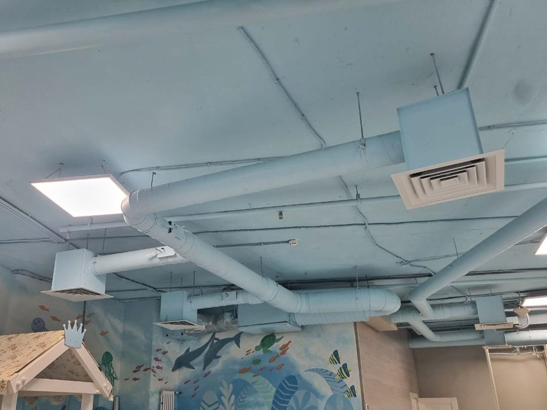 Материал воздуховодов оцинкованная сталь, это позволяет нам избежать коррозии в условиях повышенной влажности, а также применяется изоляция кофлекс которая дополнительно изолирует от влаги и лишних тепло-потерь наши воздуховоды и снижает уровень шума